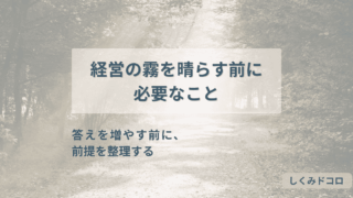 【経営の霧】 経営の霧を晴らす前に必要なこと|答えを増やす前に、前提を整理する うまくいっているのに、どこか晴れない。どの施策も正しく見えて削れない。何をもって順調と言えるのかが分からない——。そんな霧が出ているときに必要なのは、新しい答えではなく前提の整理です。本記事では、その理由を整理します。 2026.04.17 【経営の霧】